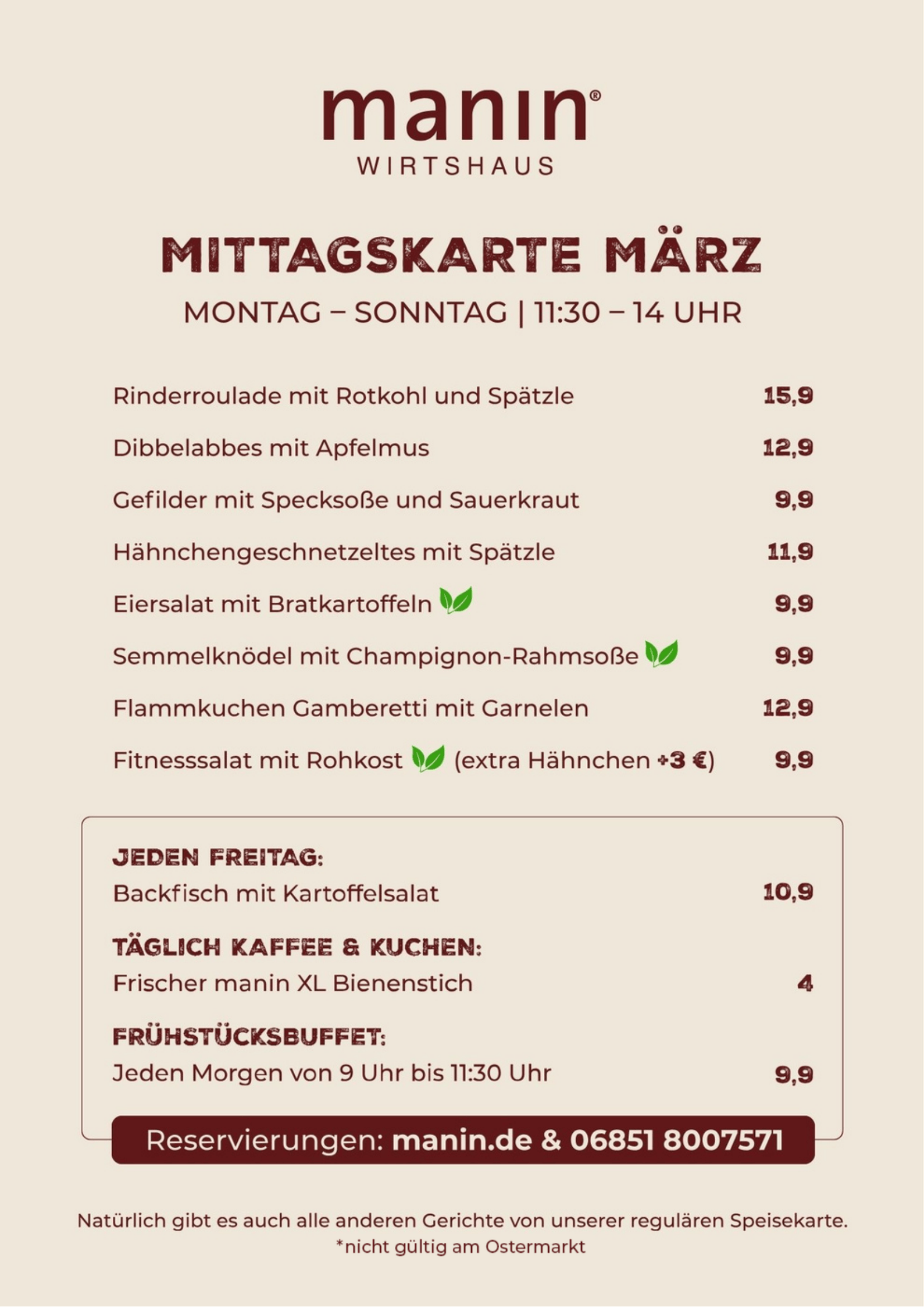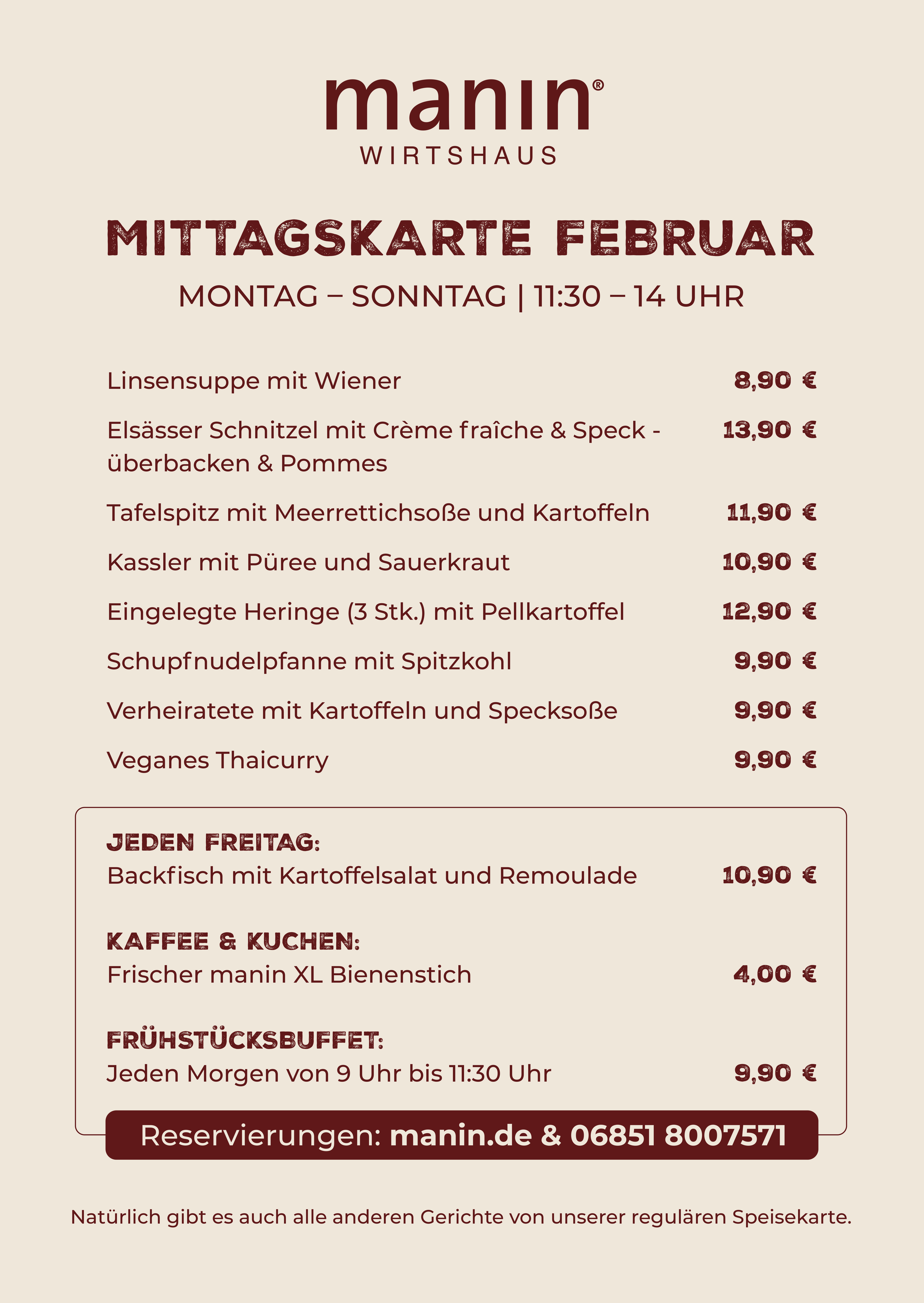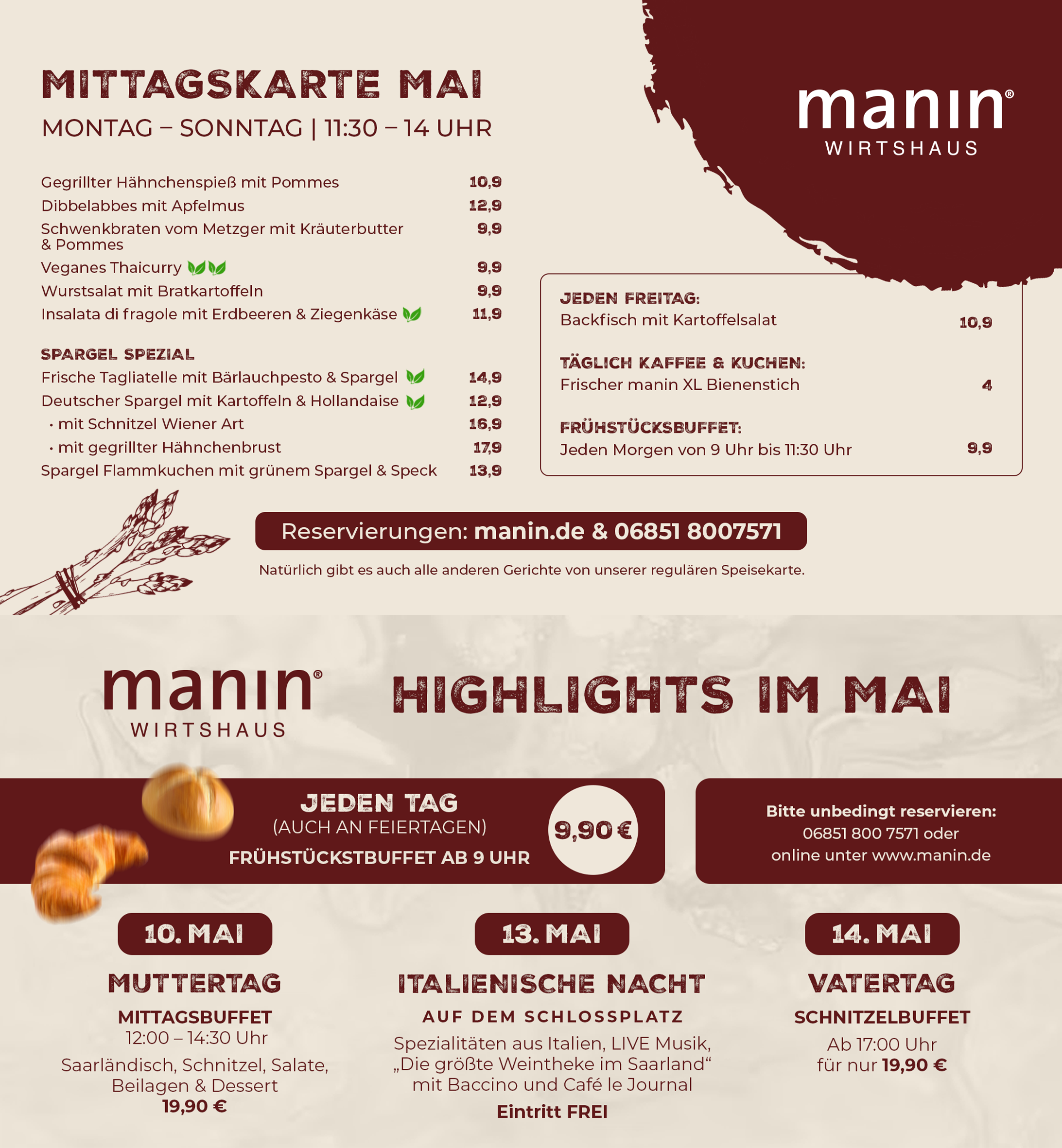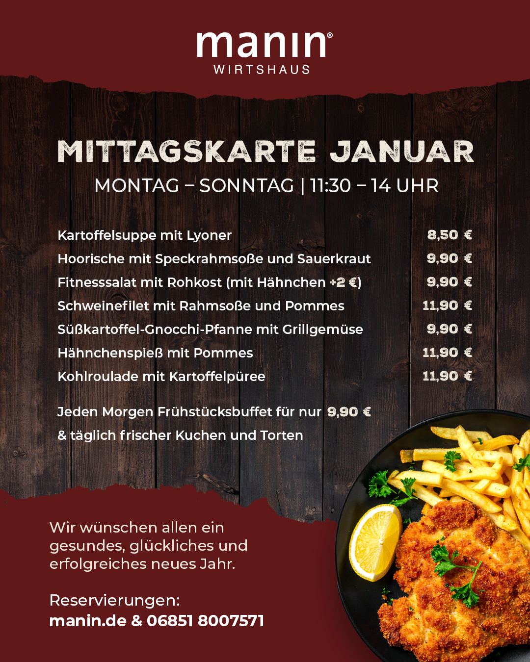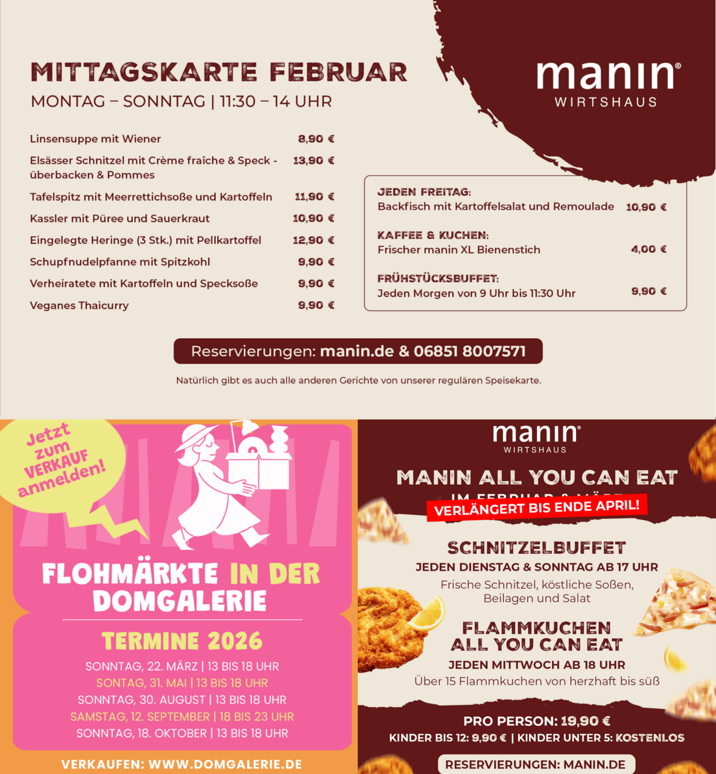 Sie möchten mit einer größeren Gruppe reservieren? Wir sind Montag bis Sonntag von 10:00 bis 18:00 Uhr telefonisch für Sie da. Bei Reservierungsanfragen per E-Mail bitte eine Telefonnummer angeben. Tel. 06851-8007571 oder kontakt@manin.de. Damit Sie und Ihre Gruppe glücklich und zufrieden sind, beraten wir Sie gerne zur einheitlichen Menüabsprache.