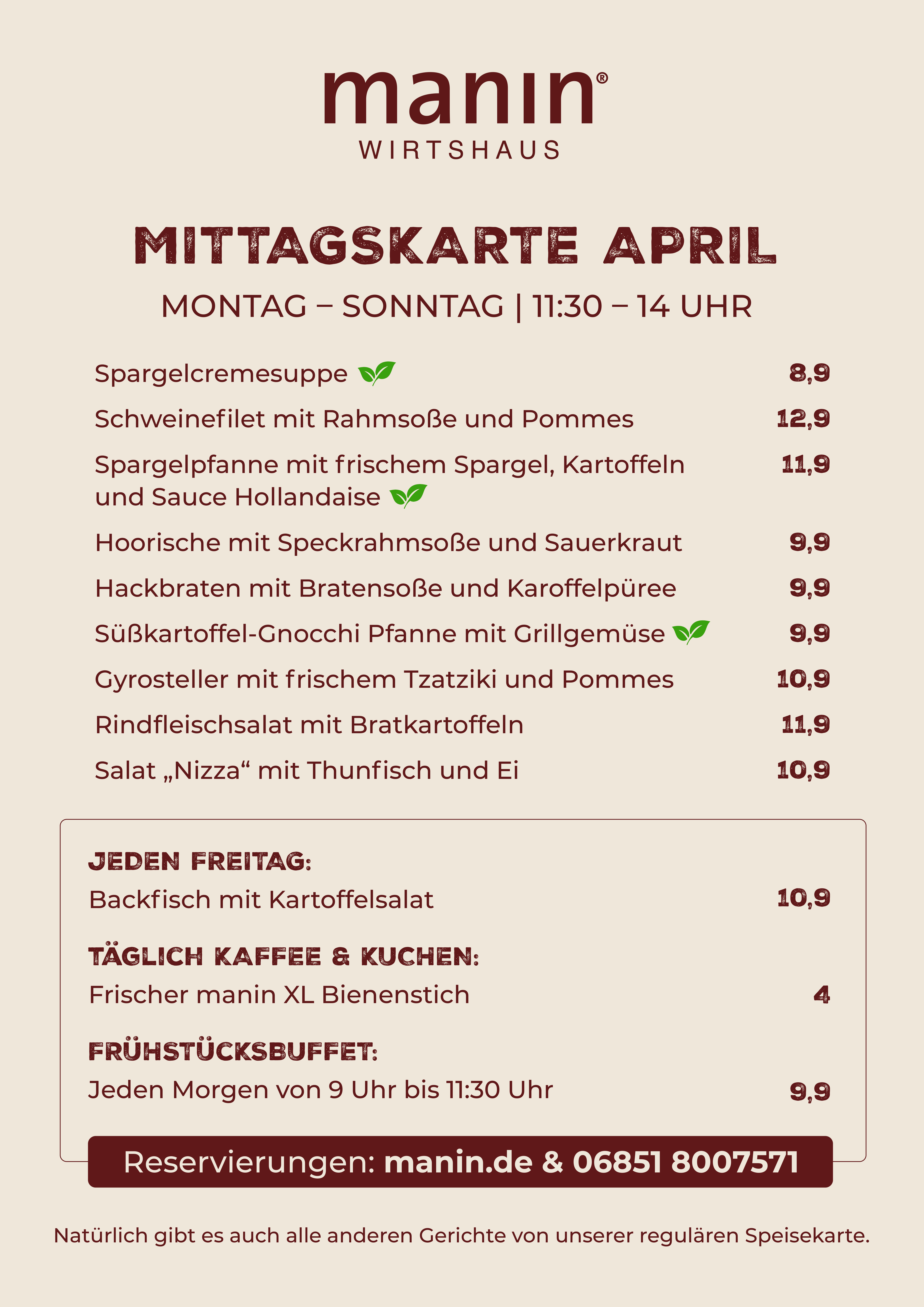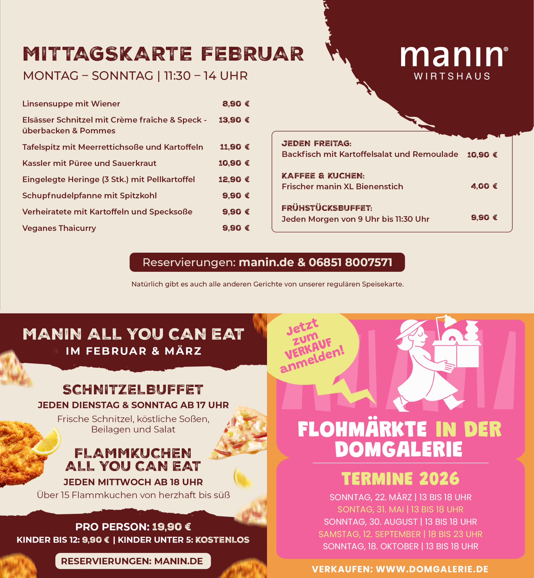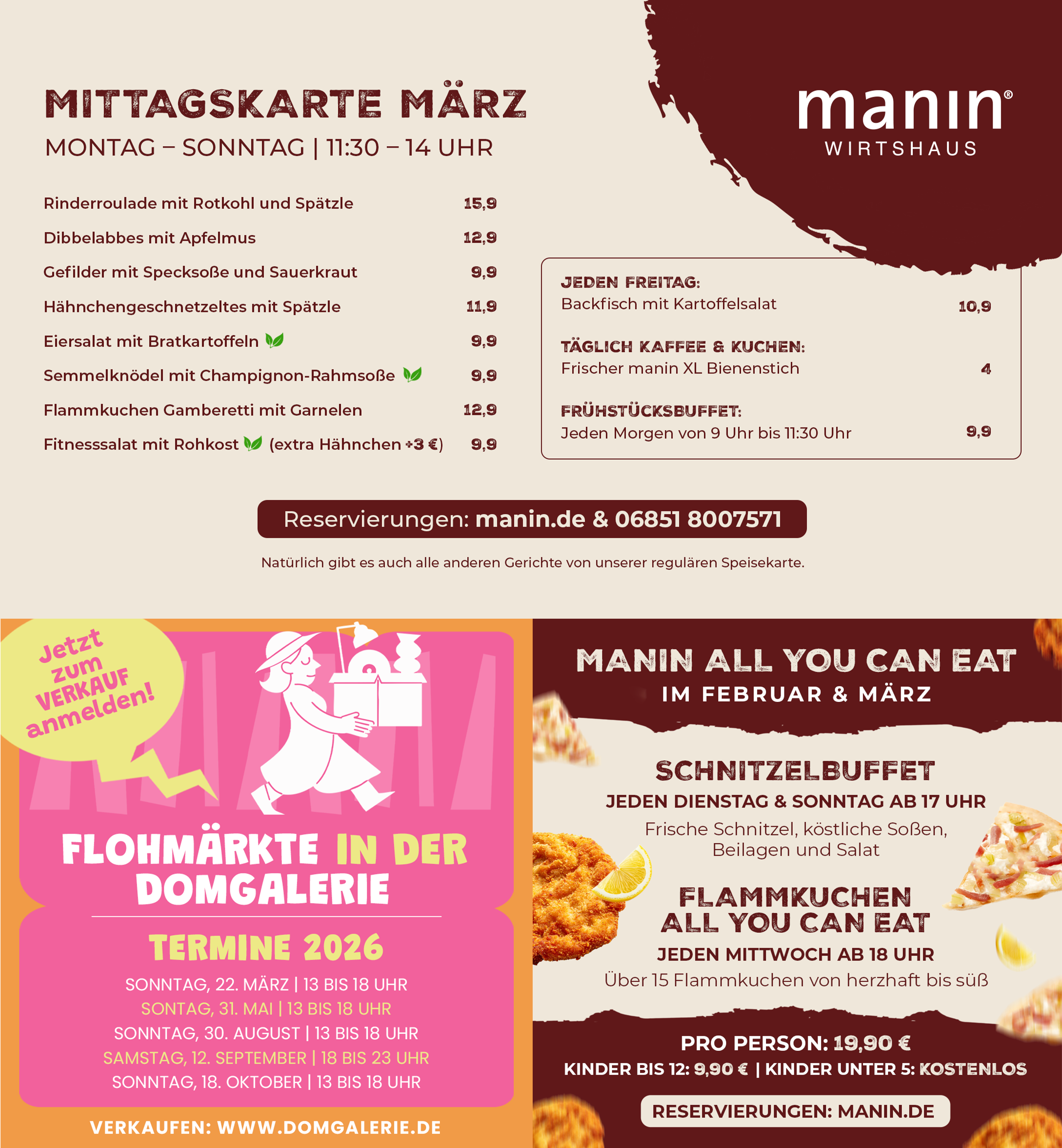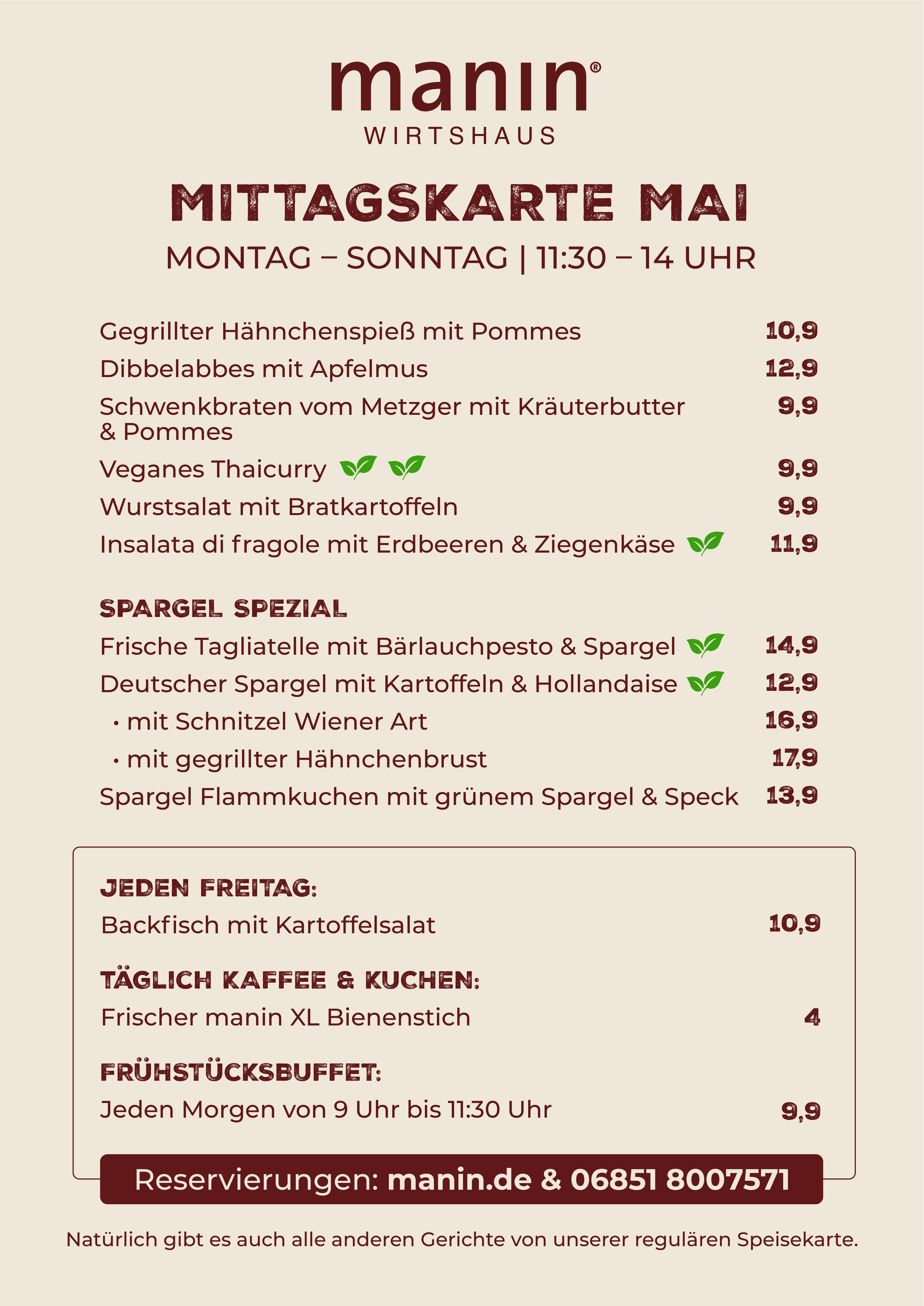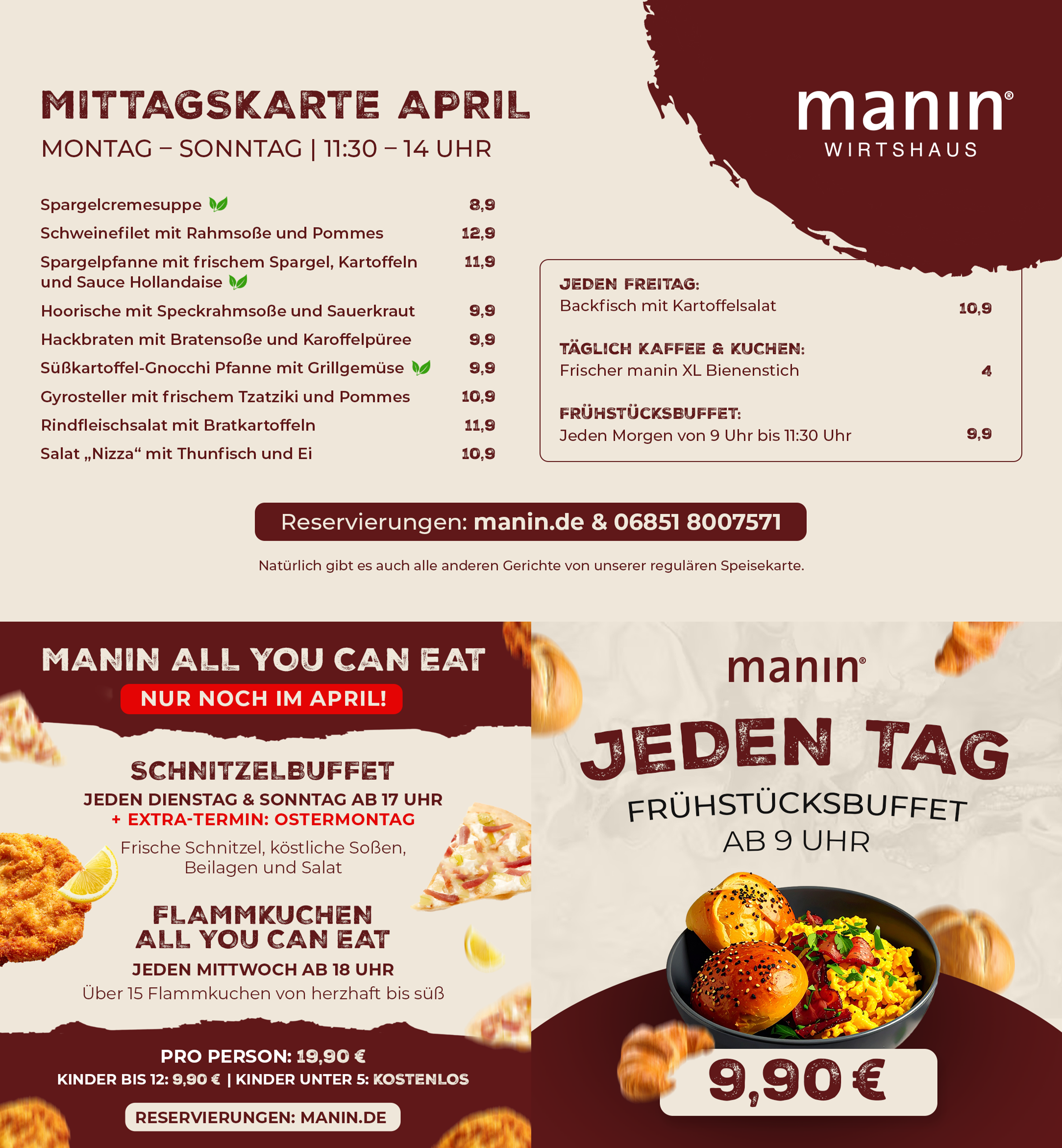 Sie möchten mit einer größeren Gruppe reservieren? Wir sind Montag bis Sonntag von 10:00 bis 18:00 Uhr telefonisch für Sie da. Bei Reservierungsanfragen per E-Mail bitte eine Telefonnummer angeben. Tel. 06851-8007571 oder kontakt@manin.de. Damit Sie und Ihre Gruppe glücklich und zufrieden sind, beraten wir Sie gerne zur einheitlichen Menüabsprache.